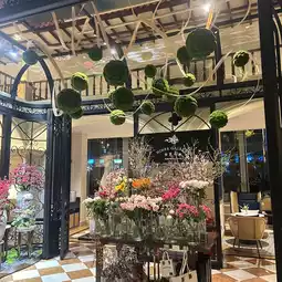 The ceiling of the hotel lobby is a sky blue white cloud pattern, and the open flower shop at the first floor entrance is eye-catching.
