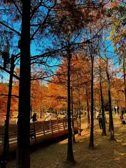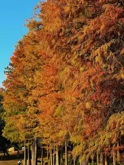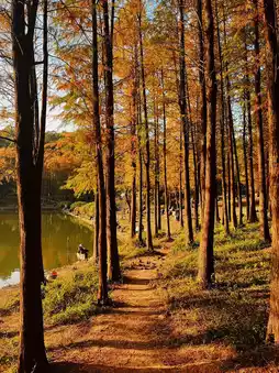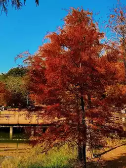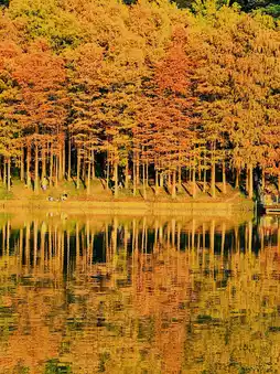 As the breeze blows, the bald cypress trees sway gently and the fallen leaves float down, like a dreamlike scene. The lake reflects their graceful shadows, adding a touch of poetry.