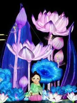 As you enter the park, colorful lights shine brightly. The lamp groups have various shapes, some look like fairy palaces, and some look like elves among flowers.