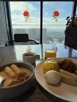 The hotel's decor is very new and clean, and the included breakfast is a great selling point. Breakfast is served on the 25th floor, the highest floor of the hotel, and having breakfast by the window is a delightful experience 😌. The breakfast food is not subpar at all, with three types of porridge to choose from, and it's a buffet!