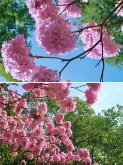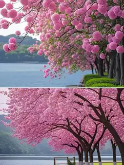 * **Bauhinia** is the first to appear, with pink and purple flowers like clouds and mist, adorning the branches and contrasting with the blue sky and white clouds, creating a romantic scene.