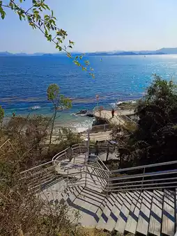Walking along the plank road, on one side is the surging sea, with waves hitting the rocks, making bursts of noise; on the other side are lush green mountains, full of greenery.