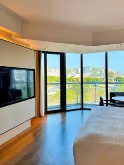As soon as you open the door to the room, you are greeted with floor-to-ceiling windows offering a beautiful view of the seaside. The sofa is as wide as a bed, making it very spacious and comfortable.