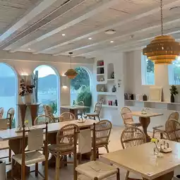 Waking up to the sound of waves and sunlight, living in a blue and white fairy tale world.