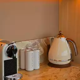 The main color of the suite has changed from the green of the guest room to blue. The room is dotted with royal blue furniture and ornaments, which has a great texture. The suite is not large, but it has all the necessary functions. The living room is also equipped with a separate guest bathroom. Once more small items are brought in, the quality will surely be even better!