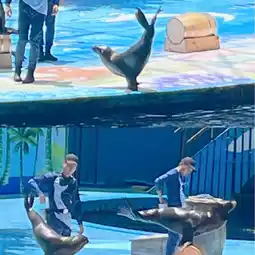 We were so lucky and caught the noon performance! The cute sea lion can not only shoot basketballs, but also perform various interesting actions to make everyone laugh. There were also wonderful diving performances by swimmers from abroad, as well as story-telling-like performances, which brought great visual experiences to the children🎉.
