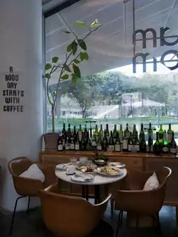 It is mainly gray and white, with large glass windows for lighting, and the windows are filled with wines with prices written on them.
