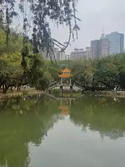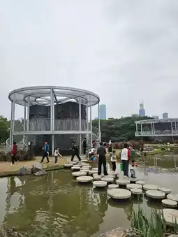 The park has a very large pond with beautiful lotus flowers and fish swimming around.