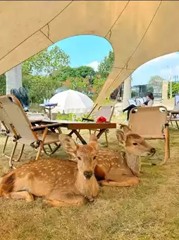 In the afternoon, you can head to the nearby "Sika Deer Park" for a glamping experience. Under a large tent, you can enjoy afternoon tea while feeding the deer. It’s a delightful interaction where you eat, and the deer eat too, creating a unique charm. It feels just like being in Nara🦌.