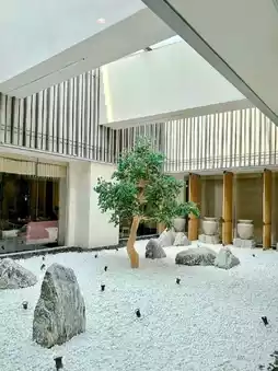 We spent the night at the Manwan Hetianju Hotel. Its Chinese garden design combined with a seaside resort view is truly special.