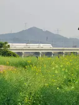 4. There is a high-speed train 🚅 passing through the flower fields in the distance, with a train every six or seven minutes. It is really a train to spring.