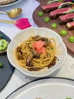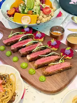 The wagyu beef, which is secretly prepared by the chef, has a crispy texture on the outside while retaining its pink and tender color on the inside. The meat is soft and crispy when eaten, and has a rich taste.