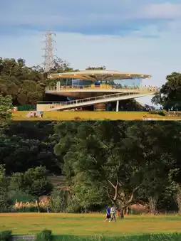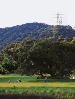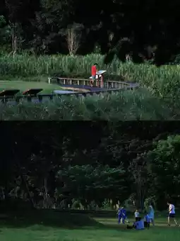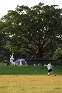 The grassy area of Enshang Wetland Park is vast and lush with greenery. As the setting sun shines down, the park is full of life with people setting up tents for camping and children playing and laughing.
