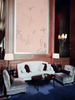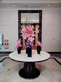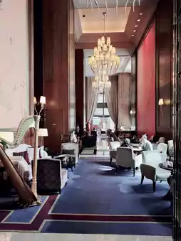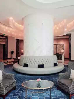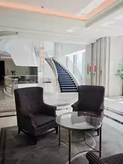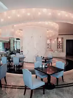 The hotel boasts a unique design that seamlessly blends British elegance with Oriental charm. The lobby is filled with the fragrance of ginger flowers and adorned with oil paintings, sculptures, and floral arrangements. A four-story marble spiral staircase, complemented by crystal chandeliers and blue fish-scale carpets, exudes luxury and sophistication.