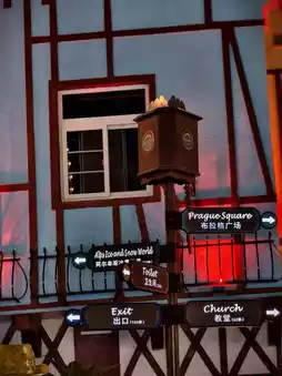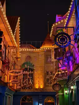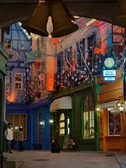 The street lights came on, casting soft light on the quaint streets. The shop signs are colorful, setting off the bustling crowd.