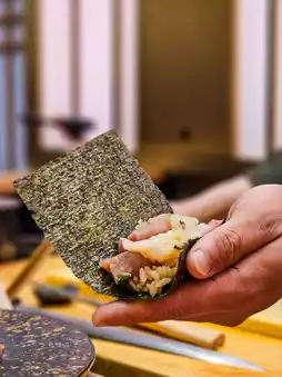 Seaweed wraps fresh sashimi pieces.