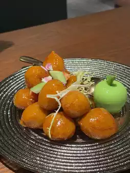 First Love Sweet and Sour Pork: Sweet and Sour Pork, crispy on the outside and tender on the inside, paired with green apple mousse, has a sweet and sour taste with rich layers of texture.
