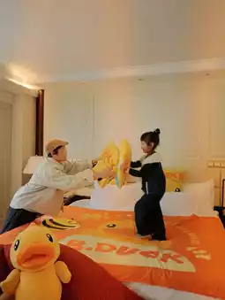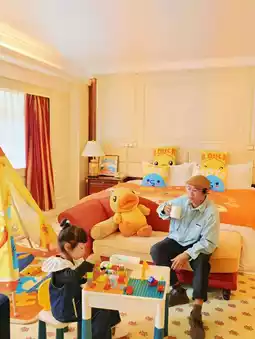 If you bring your children, you can stay in the parent-child suite, which is an open-plan suite. The parent-child room is built with a little yellow duck theme. It is cute and adorable, and comes with pillows, bed covers, tents, little yellow duck airplane models, large little yellow duck dolls, etc. The room facilities are also complete, with a bathtub and children's footstools in the bathroom. It is really thoughtful.