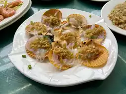 The oysters are steamed with fresh minced garlic. They are delicious and have a smooth texture. Every bite has a strong garlic flavor and is very appetizing.