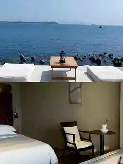 The homestay has a total of 14 rooms and 5 room types. All rooms are equipped with floor-to-ceiling windows, and each room has an excellent sea view. 🌊Lying on the soft bed, you can see the vast sea as soon as you open your eyes. The sea breeze is gentle and very pleasant! The interior of the room is mainly decorated in the wabi-sabi style, with rattan chairs, mid-century log furniture, and tropical elements, which is quiet and high-class. The mini bar, five-star hotel Serta mattress, and Ferragamo toiletries 🧴show the quality in the details.