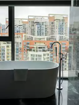 The two-bedroom, one-living room, two-bathroom apartment is super family-friendly. There is a large master suite for the parents to sleep in, and a children's room with twin beds. The children's room also has a washbasin with steps down, which is super thoughtful!