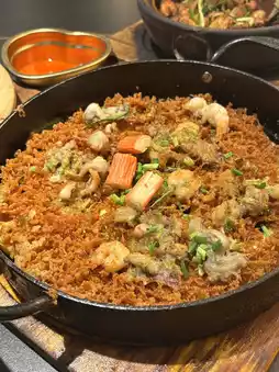 Fry until golden and crispy add shrimp, squid with oysters! The palate is richer