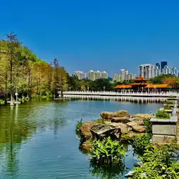 There are many bridges in the park. Some of them are simple and elegant, such as Lanyue Bridge, Jinyue Bridge and Feihong Bridge. They are built along the lake and span across Lihu Lake. Standing on the bridge, you can overlook the landmark skyscrapers such as the Kingkey 100 Building and the Diwang Building.
