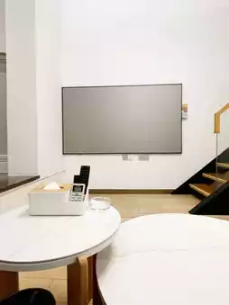 Near the sea 🌊 this room has comfort and modern aesthetics. The floor-to-ceiling windows have a mountain sky line. The bed is super comfy. Plus, there’s a screen projector. Who likes movie marathons!?