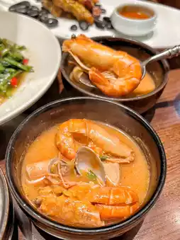 This soup is made by the royal chef. It uses the secret recipe of a Thai royal chef. The soup is sour and spicy. Using more than 10 air-shipped Thai spices, they are simmered for 6 hours to ensure a rich blend of seafood and spices in every bite. The soup is added with Roche shrimp and red squid, which makes people endlessly reminisce both in terms of mouthfeel and freshness. It is an excellent choice for appetizers🍤