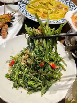 Using fresh Cantonese hollow cabbage, stir-fried over high heat, maintaining the crispness and saltiness of the cabbage heart, it is a very popular Thai hot stir-fry. Simple but addictive, definitely a good choice with meals 🥗👌