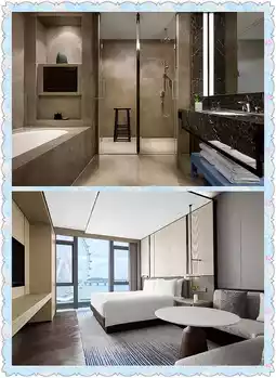 The room amenities are also very thoughtful. From my room, both the bedroom and bathroom offered stunning views of the bay area. To the right of the entrance is the luggage area, and to the left is the mini bar and a hidden cloakroom, a practical and well-designed layout. The room design is modern and minimalist, with a strong business vibe yet adorned with Chinese totems. The mirror and railing design of the luggage rack create a sense of openness. Although not a suite, the bathroom is spacious and comfortable, allowing for easy movement.