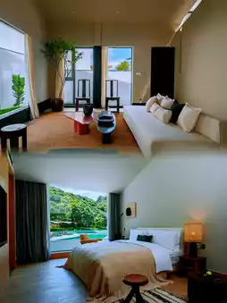 The 24 guest rooms are embraced by mountain views, with lush greenery visible at a glance. Room furnishings are minimalist yet meticulously designed, with stone and wood elements creating a natural sanctuary. Enjoy the sunset through floor-to-ceiling windows, with distant mountains offering a healing, calming experience!