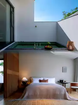Six white buildings feature traditional white walls and dark tiles, arranged like a village. Geometric lines cast shadows in perfect harmony, while the play of light and shadow in the southern mountain forest shifts with time. Every detail of light in the courtyard seems sculpted, with a single tree casting ever-changing shadows throughout the day. The peaceful, gentle architecture creates a deeply relaxing atmosphere.