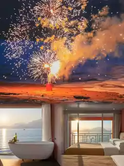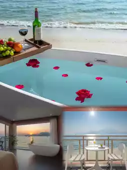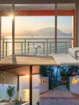 The rooms have bathtubs, so you can soak in a private bath and watch the sunrise and sunset. You can also have barbecues and parties in the yard and have fun with friends until dawn. There are 25 seaview rooms in total, with huge floor-to-ceiling windows and balconies with seaview bathtubs. At night, you can lie down and listen to the sound of the waves and watch movies on the projector. It's so relaxing.