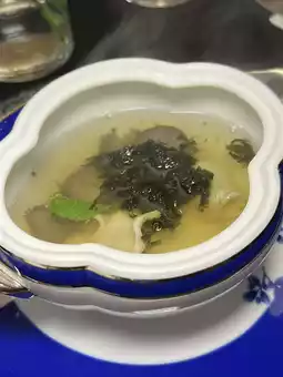 [Headwater Seaweed Surf Sea Cucumber] Use hot old chicken soup with dried shrimp and pepper, now infused with sea cucumber and headwater seaweed. The soup is clear, fresh and refreshing, warming and refreshing. There’s also a little bit of very beneficial chrysanthemum blue in it to bring out a little bit of sweetness and bitterness.