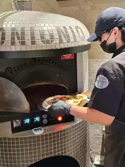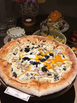 The black truffle pizza is baked in a traditional kiln oven in Southern France.