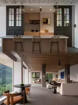Miyue Resort Shenzhen, located in Tianlu Secret Wild Fairyland, is built on a hillside and cleverly hidden in a dense jungle, as if it were part of this mountain. The designer uses a large number of natural materials such as logs, stone, and glass to outline the space with simple and modern lines, which not only retains the rugged atmosphere of the mountains, but also has a refined and elegant vacation texture.