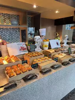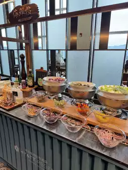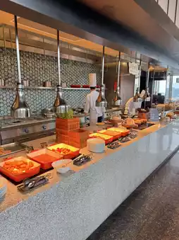 The biggest surprise was yet to come 😎👀—a chef pushing a cart loaded with ingredients, preparing unique breakfast items right in front of the guests 🤩. Today’s special was poached egg salsa waffle 🧇.