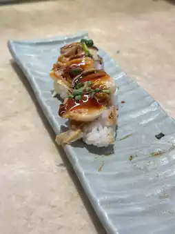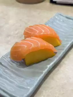 A highlight is the unique sushi options that are rarely seen in Hong Kong: for example, the salmon and mango sushi without rice. It features a large piece of mango topped with a slice of salmon, priced at 36 RMB for two pieces. The mango is sweet and has a nice texture, likely from Pakistan. Another standout is the seared scallop sushi, which has a distinct seafood flavor 👍🏻.