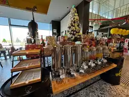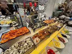 This hotel package includes breakfast and dinner buffet, the day in the lounge all-you-can-eat after 🍸 around six o'clock to go to the restaurant to eat buffet dinner, the restaurant is very large, there are many things to choose from, just in time for Christmas, there are many Christmas decorations and desserts, very Christmas atmosphere 🎄 Also Live Band🎶 The special thing about the buffet here is red, white and beer, and plenty of soda and juice for you to choose from🍾 Food, we think the more special is the grilled oysters🦪, steak🥩 and knife cut beef, very tender😋 Lots of fruits and desserts.