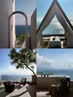 The design blends the elegant forms of cliffside soaking pools, caves, and blue-and-white buildings with natural scenery.