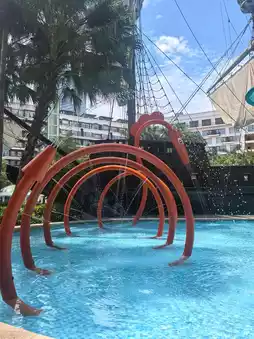 Pool Paradise: The hotel boasts a 2,000-square-meter outdoor pool resembling a "Caribbean Sea" in the city🏝. Surrounded by palm trees and white sand, lounge on beach chairs while soaking up the sun and breeze—it’s like a tropical island getaway. The crystal-clear water and kids' splash zone with bubble shows make it perfect for family fun.