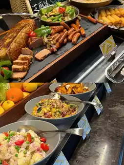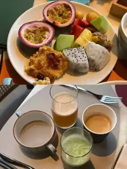 This is also my favorite part! Just looking at the fresh melons 🍉🍊 with their colorful hues whets the appetite, though unfortunately, my eyes are bigger than my stomach. The variety is super rich, with on-site baking done with care. Melon juice 🍈 + cucumber juice 🥒 + hot Americano coffee ☕ + soy milk, these four drinks start a day full of energy.