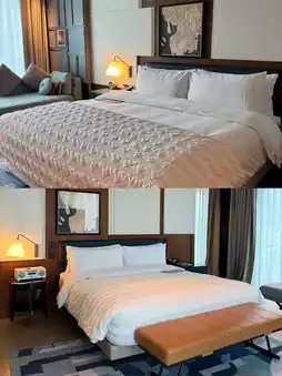 The 8th-16th floors are king bed rooms, the 16th-25th floors are selected rooms, and above the 25th floor are executive rooms. This time, the room was on the 21st floor, 40 square meters, just the right size. The interior matches the style of the lobby, exquisite and comfortable, perfectly fitting my aesthetic. The contrast between wooden furniture and the light green accent wall is fresh yet steady. I love the black and white large bathtub 🛀🏻. Most importantly, the mattress is moderately firm... After a week of hard work, my body was honest and conquered in a second. The bath products surprisingly are Malin+Goetz, the mint shampoo has a faint cooling sensation, a delightful experience, girls are easily won over by this. The only downside is that there were no snacks in the mini bar. 🥨