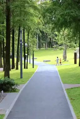 A spacious park featuring vibrant red bald cypress trees, along with attractions like a Stonehenge replica, glass houses, Chinese-style courtyards, and arched bridges—great for strolling and snapping pics.