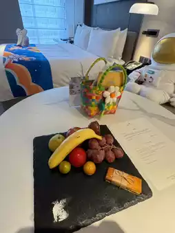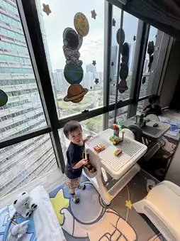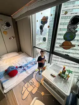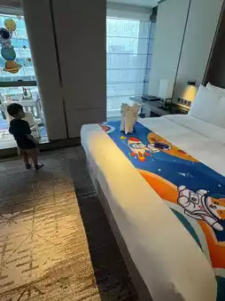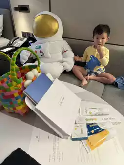 As soon as Lisboy entered the suite, he was greeted by astronaut decorations 🧑🚀, a Welcome Gift, a spacious double bed, a large bathroom, and countless space-themed ornaments 😍. The highlight was a children's space corner complete with a mattress 🌟 designed in a tatami and space style ✨. There were also plenty of kids' play facilities, including a building block table and drawing materials 🎨, keeping Lisboy entertained without even leaving the room 😍.