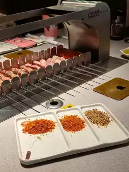 The Baiyu skewers are marinated with fruits and vegetables, making them incredibly tender and juicy. The Huichun skewers are marinated with spicy seasonings, each with its own unique twist. I also ordered a bunch of bananas, which turned out like eggplants after grilling!