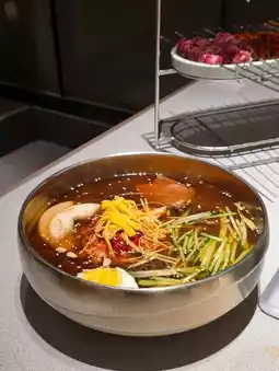 For main course, I chose cold noodles. The beef bone broth is paired with springy buckwheat noodles and toppings. It's slightly sour and spicy, and delicious. It's a great option on a hot day!
