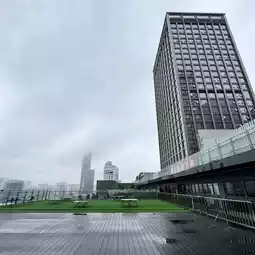 Looking at the Spring Cocoon Building and the city skyline from afar