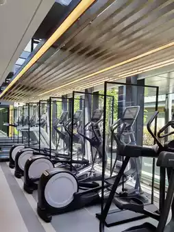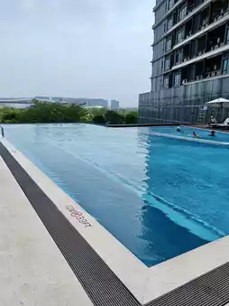 I took a dip in the pool during a breezy afternoon. The poolside design is minimalist, surrounded by lush greenery that shields it from the city's clamor. The water mirrors the blue sky and distant glass facades, making it feel like an aerial sanctuary. This is the perfect retreat to relax and rejuvenate, providing a gentle balance to a hectic schedule.